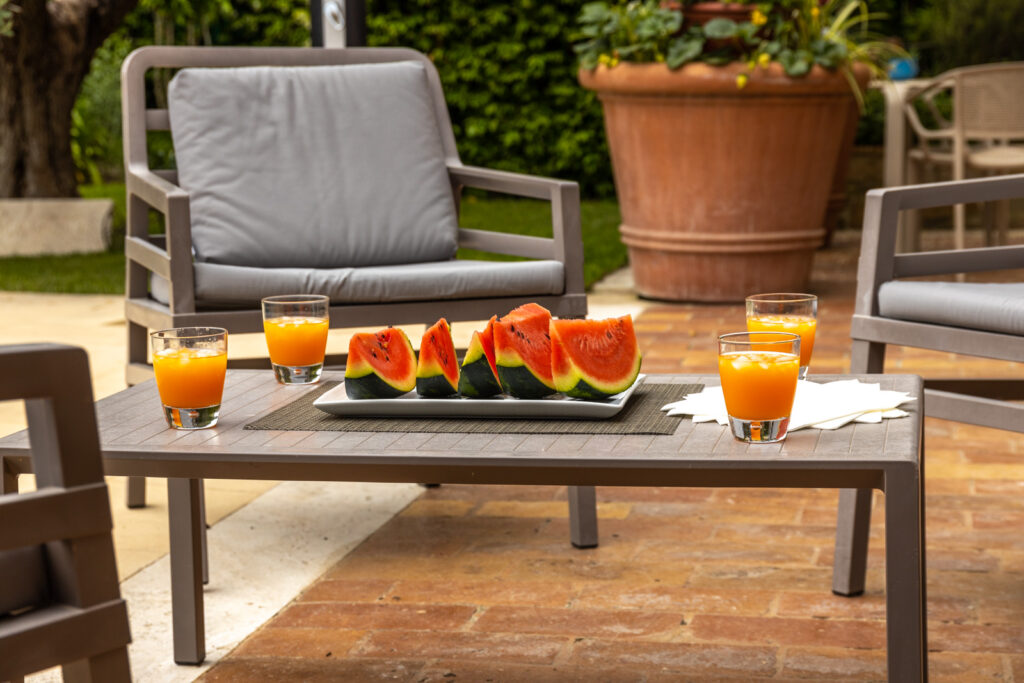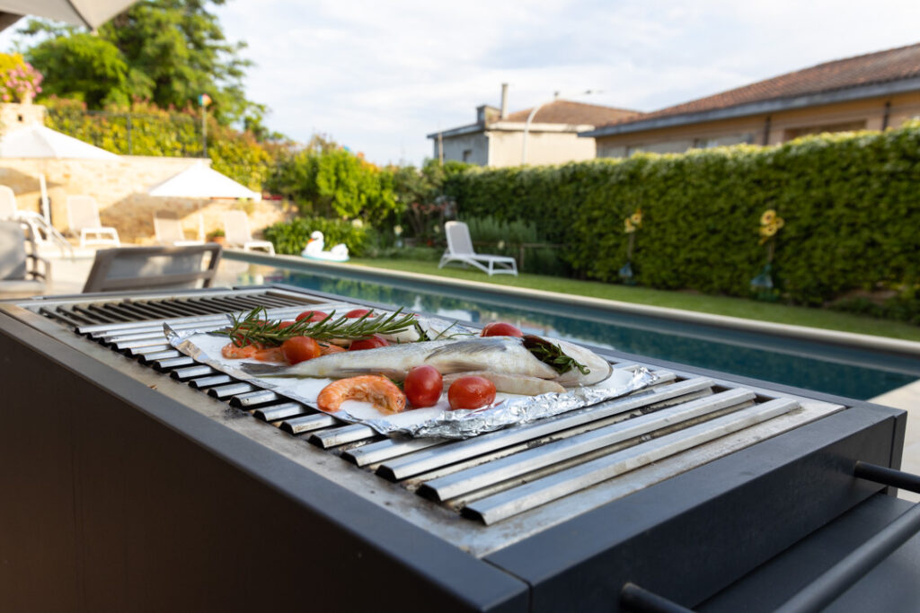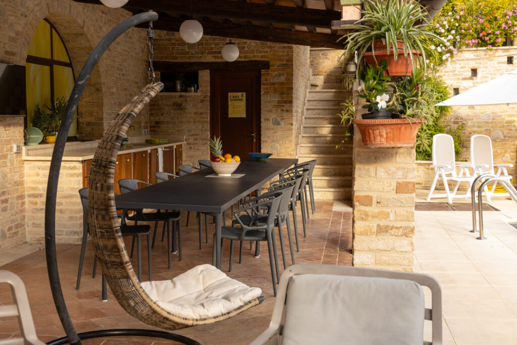 Nell’ampio patio adiacente alla piscina, avete a disposizione una cucina completamente attrezzata per preparare autonomamente i vostri piatti preferiti. Inoltre potrete organizzare i vostri barbecue e l’angolo delle nerbe aromatiche sarà a disposizione per le vostre ricette più creative.
