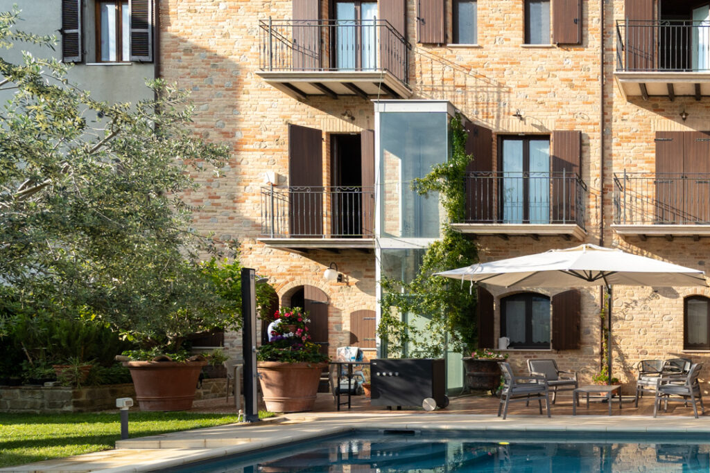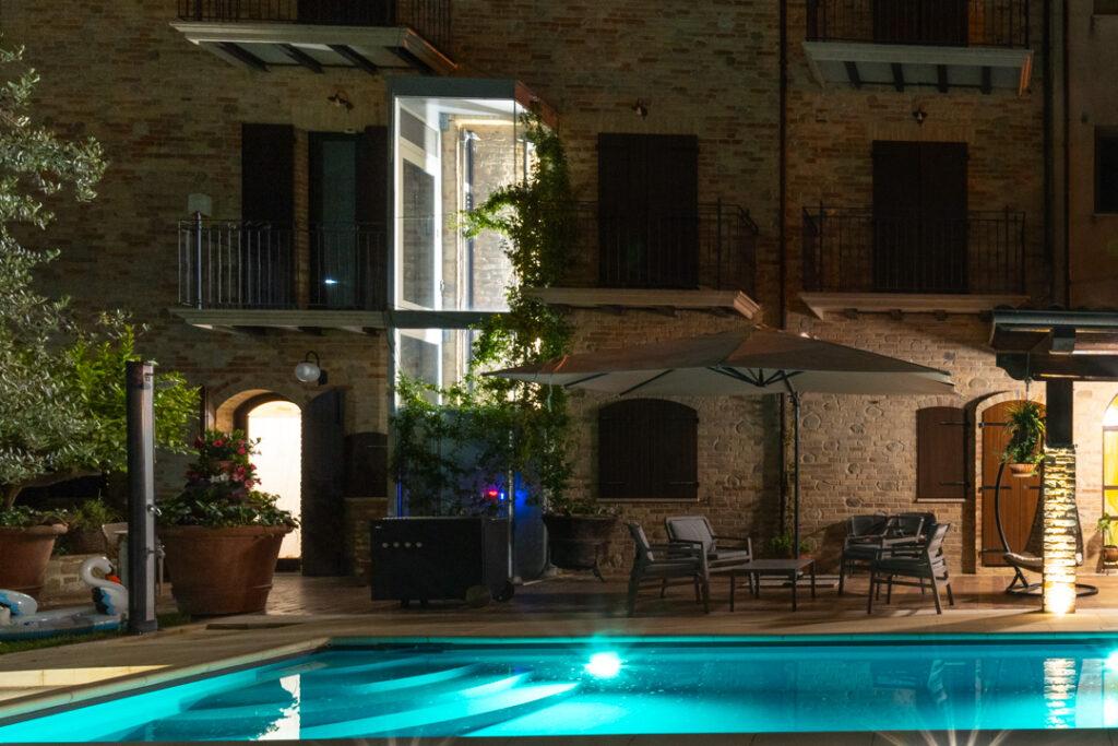 Un comodo ascensore esterno permette agli ospiti, anche disabili, di raggiungere il piano piscina senza difficoltà, eliminando così le barriere architettoniche dal piano terra al piano ribassato.